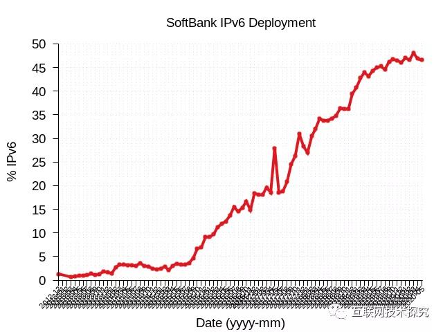 圖7 Soft Bank IPv6部(bu)署曲線(xiàn)圖 |