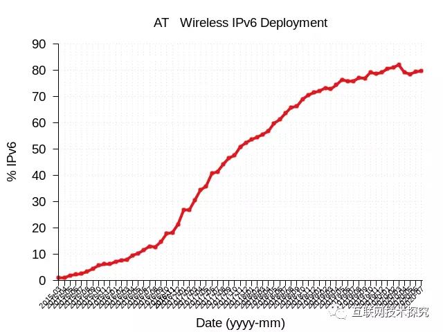 圖2顯示了(le)T-Mobile在(zai)IPv6部(bu)署方(fang)面的(de)成(cheng)果。AT&T美國(guo)第二大(da)移動(dòng)運營(ying)商(shang),圖3顯示AT&T Wireless在(zai)2015年(nian)開始啓用(yong)IPv6,到(dao)2020年(nian)IPv6使用(yong)率已經(jing)突破了(le)80%。
