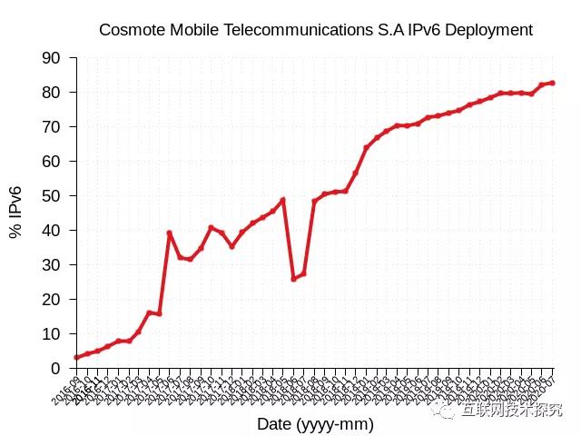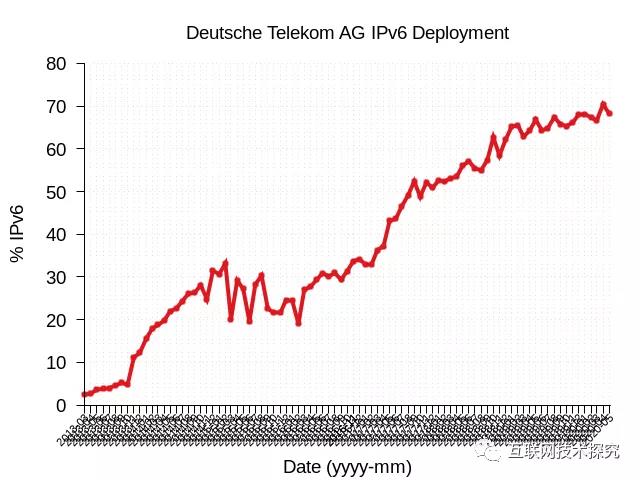 歐洲方(fang)面,Cosmote昰(shi)希臘最大(da)的(de)移動(dòng)運營(ying)商(shang),用(yong)戶(hu)達到(dao)了(le)790萬,圖5顯示它在(zai)2016年(nian)開始啓用(yong)IPv6,在(zai)4年(nian)內(nei)将IPv6部(bu)署率提升到(dao)了(le)80%。德(dé)國(guo)電(dian)信(xin)運營(ying)商(shang)Deutsche Telekom AG,在(zai)7年(nian)時間內(nei)将IPv6部(bu)署率提升到(dao)了(le)70%(圖6)。