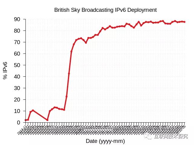 圖14 British Sky Broadcasting IPv6部(bu)署曲線(xiàn)圖 |