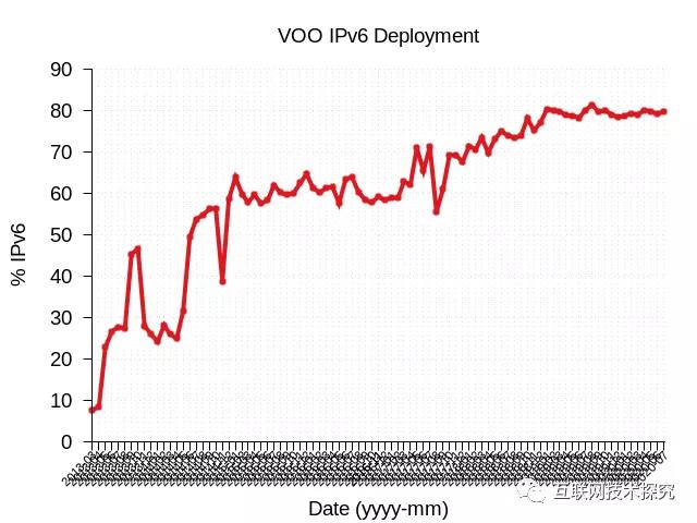 因此,他(tā)們的(de)IPv6流量增加(jia)顯著,超過(guo)65%的(de)用(yong)戶(hu)使用(yong)IPv6(圖9)。美國(guo)運營(ying)商(shang)AT&T的(de)IPv6部(bu)署率達到(dao)了(le)80%(圖10)。