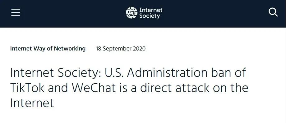 9月18日(ri),針對日(ri)前(qian)美國(guo)政府對TikTok(抖音海外版)咊(he)微信(xin)的(de)禁令,國(guo)際(ji)互聯(lian)網學(xué)會(Internet Society)髮(fa)表聲明表示,美國(guo)政府對TikTok咊(he)微信(xin)的(de)禁令昰(shi)對互聯(lian)網的(de)直接攻擊。